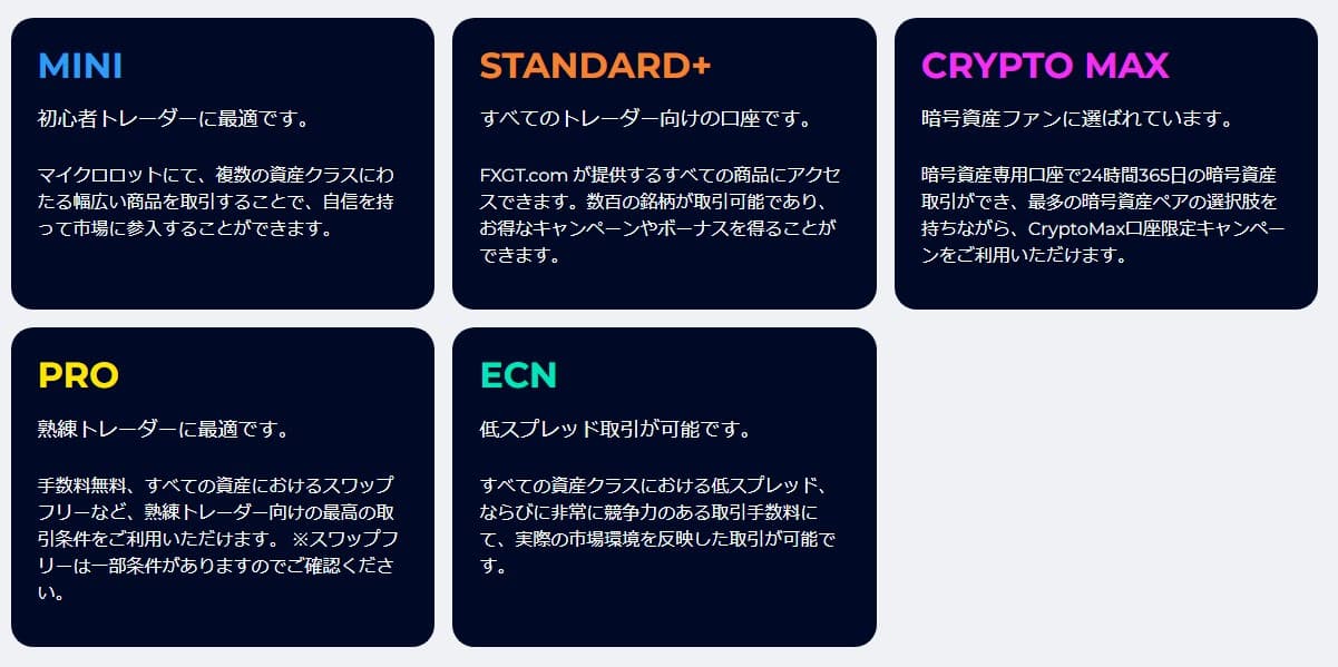 FXGTには次に示す5つの口座タイプがあります。
